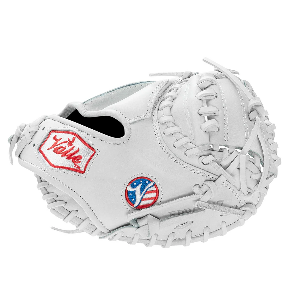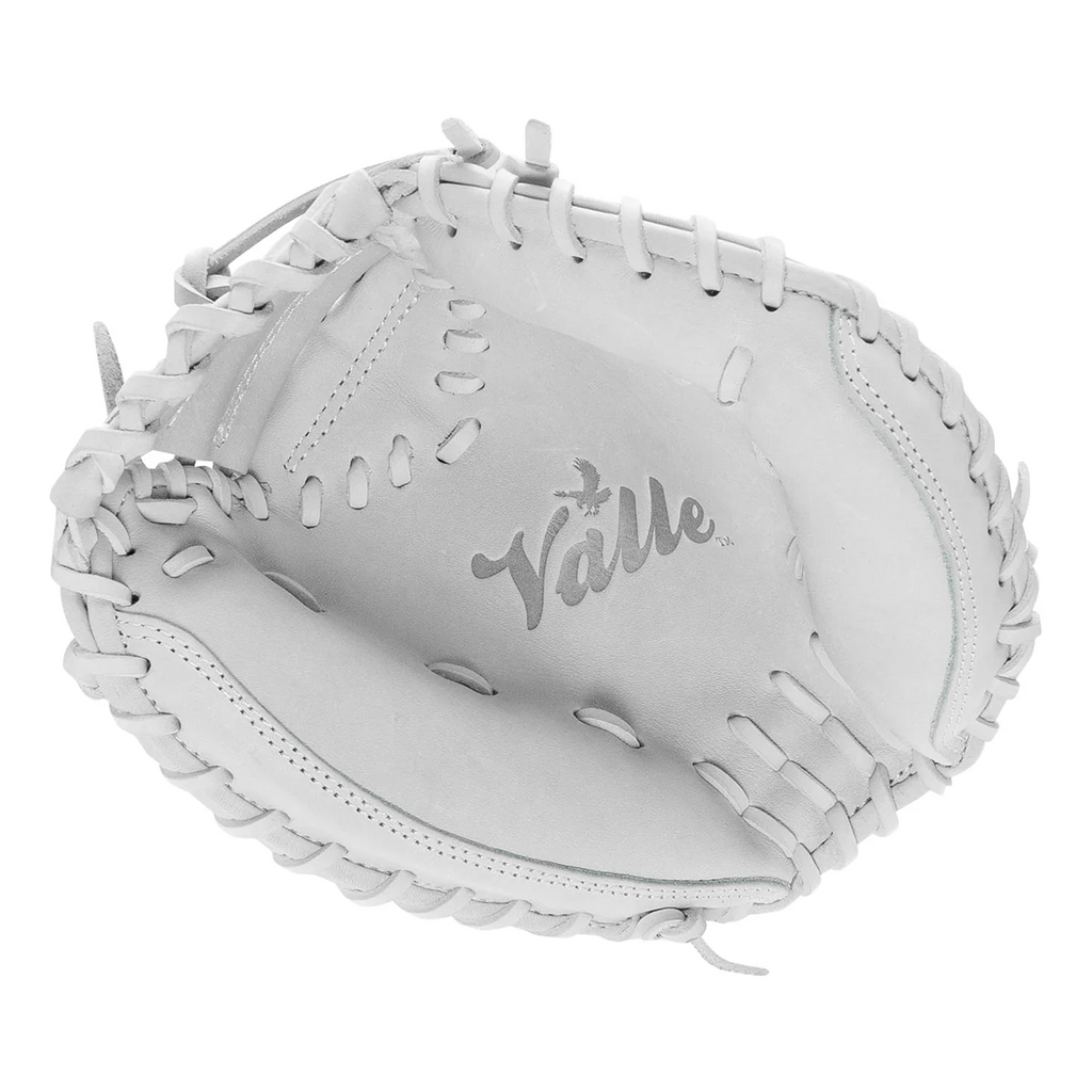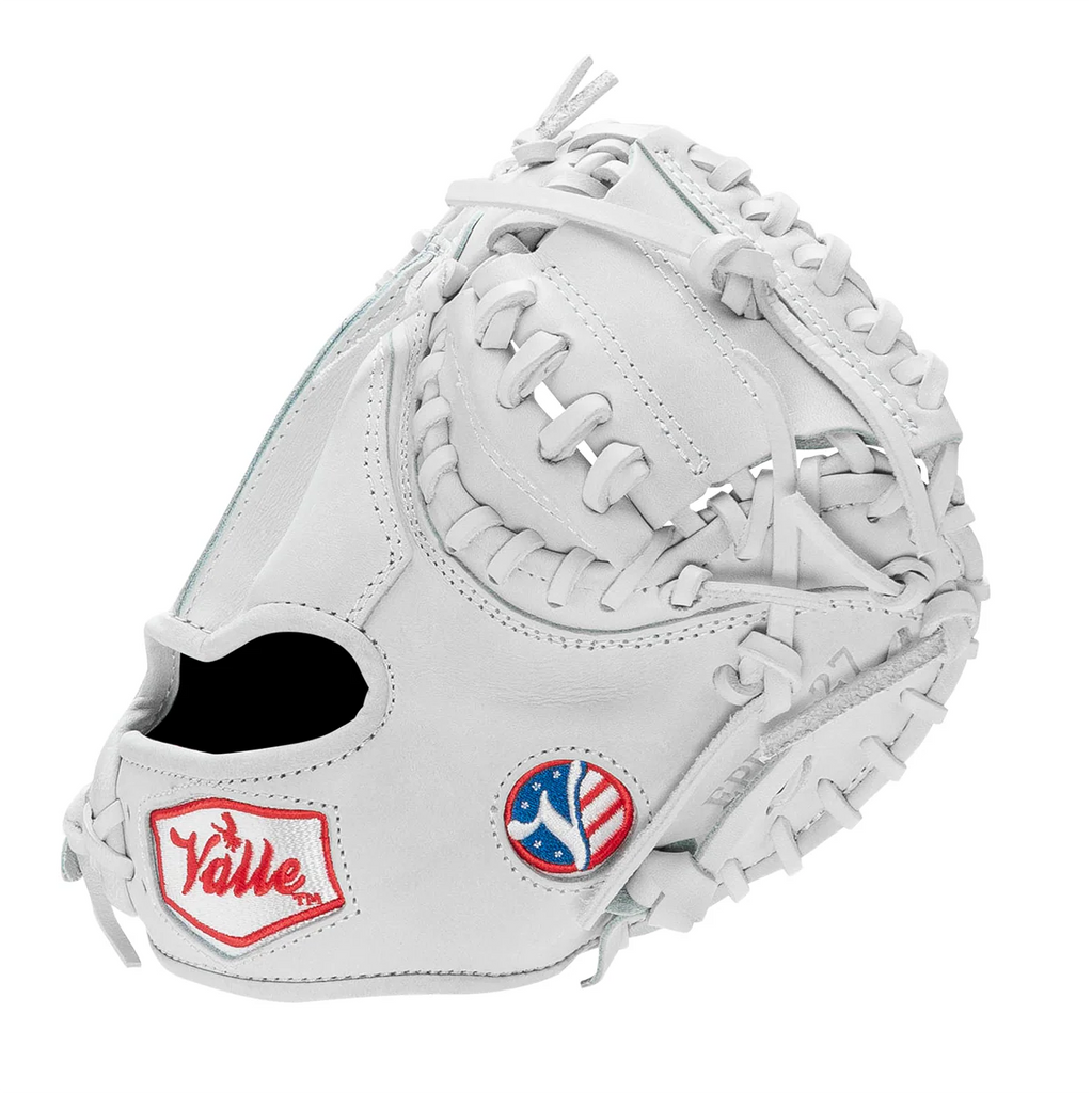 Valle Eagle PRO 27 model in the Valle trademark all white color, with USA Kip Leather. Eagle PRO 27 has been improved to the highest quality that one could buy. The Eagle PRO 27, is made with quality USA Kip leather, major league quality USA tanned lacing, additional padding and the design and shape is what the pros have been asking for. This training glove will help you to catch the ball with better mechanics. Quality built to last, with small size pocket to promote good catching habits for catcher's as they warm up pitcher's and use in all practice times. Catcher's need to have good ball transfer and focus when catching. This mitt will help the high school to pro player improve the key skills of being a good receiver.